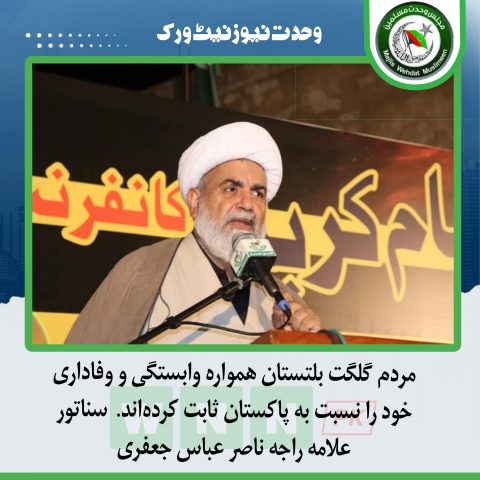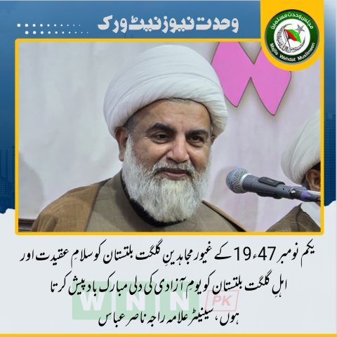 وحدت نیوز نیٹ ورک (اسلام آباد) چیئرمین مجلس وحدت مسلمین پاکستان سینیٹر علامہ راجہ ناصرعباس جعفری نے یوم آزادی گلگت بلتستان کے موقع پر اپنے پیغام میں کہاکہ یکم نومبر