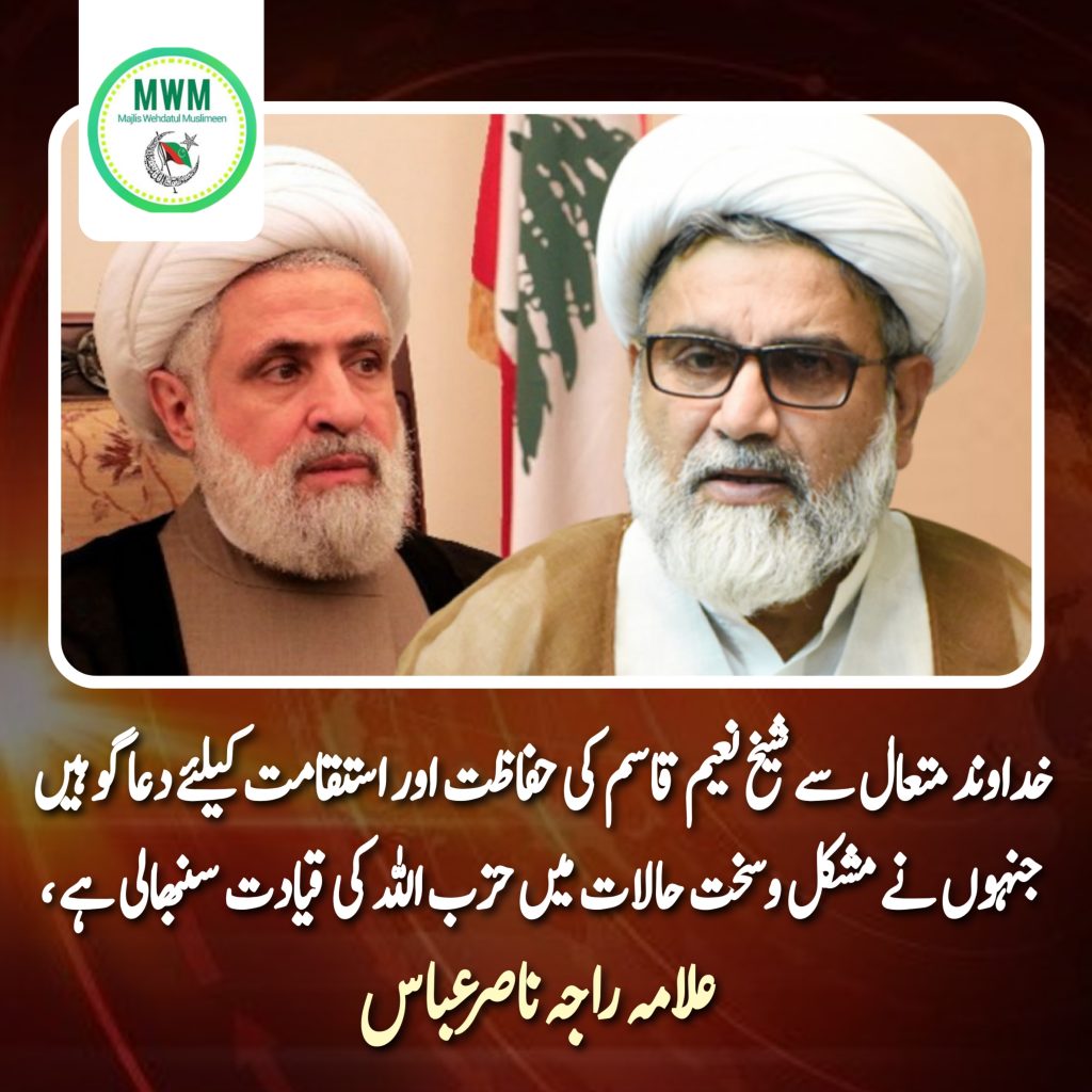 علامہ راجہ ناصرعباس نے کہا کہ میںخدا وند متعال سے شیخ نعیم قاسم کیلئےاستقامت اور رہنمائی چاہتا ہوں کیونکہ وہ اس غیر معمولی اورمشکل وقت میں حزب اللہ کی قیادت سنبھال رہے ہیں۔ غزہ میں اسرائیل کی جانب سے جاری نسل کشی اور لبنان میں جارحیت نے حسن نصر اللہ اور ہاشم سیف الدین کی شہادت کے باوجود حزب اللہ کے جنگجوؤں کی غیر متزلزل مزاحمت کو جنم دیا ہے۔