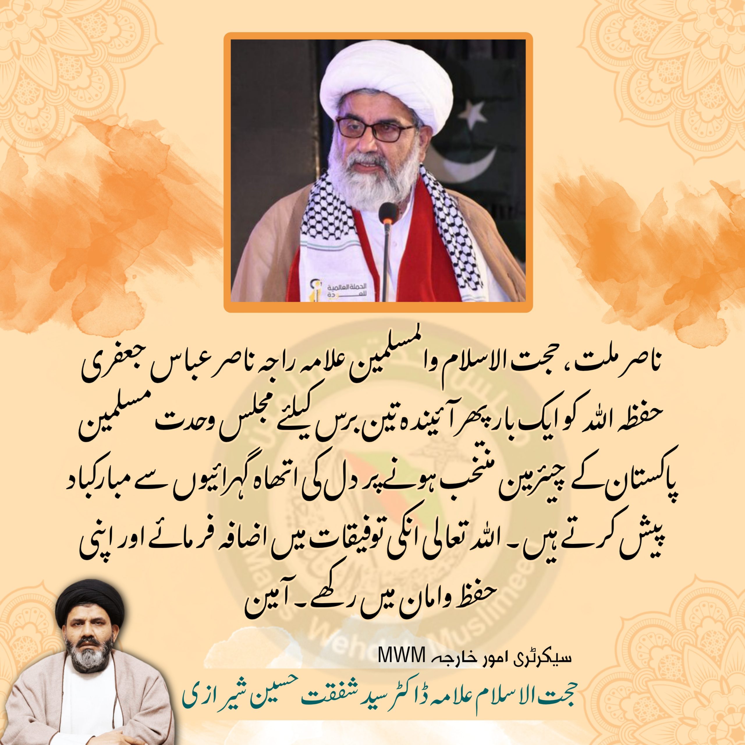 علامہ راجہ ناصر عباس جعفری آئیندہ تین سال کے مجلس وحدت مسلمین پاکستان کے چئیرمن منتخب، سیکرٹری امور خارجہ علامہ ڈاکٹر شفقت حسین شیرازی کی جانب سے خصوصی مبارکباد