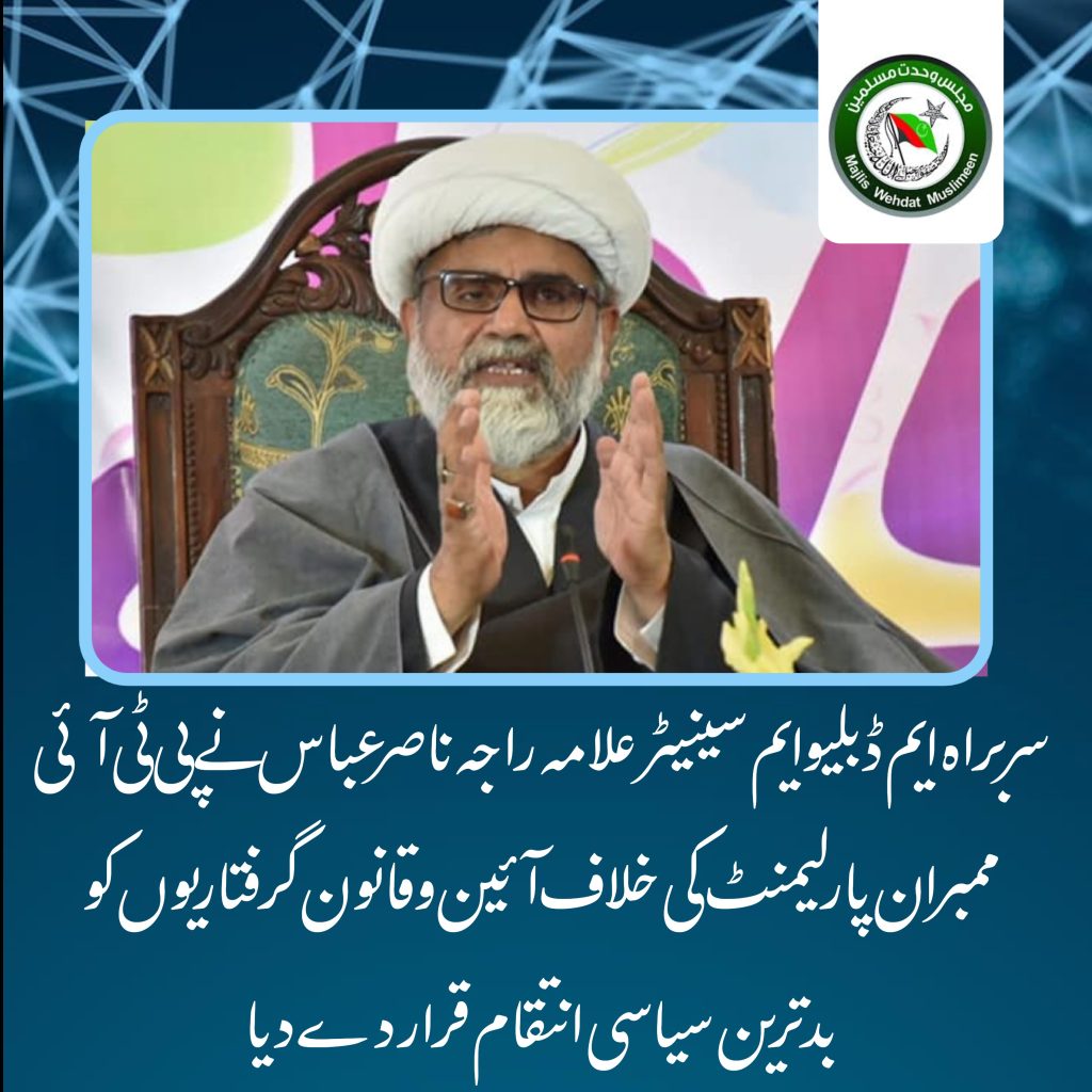 سربراہ ایم ڈبلیوایم سینیٹر علامہ راجہ ناصرعباس نے پی ٹی آئی ممبران پارلیمنٹ کی خلاف آئین وقانون گرفتاریوں کو بدترین سیاسی انتقام قراردےدیا