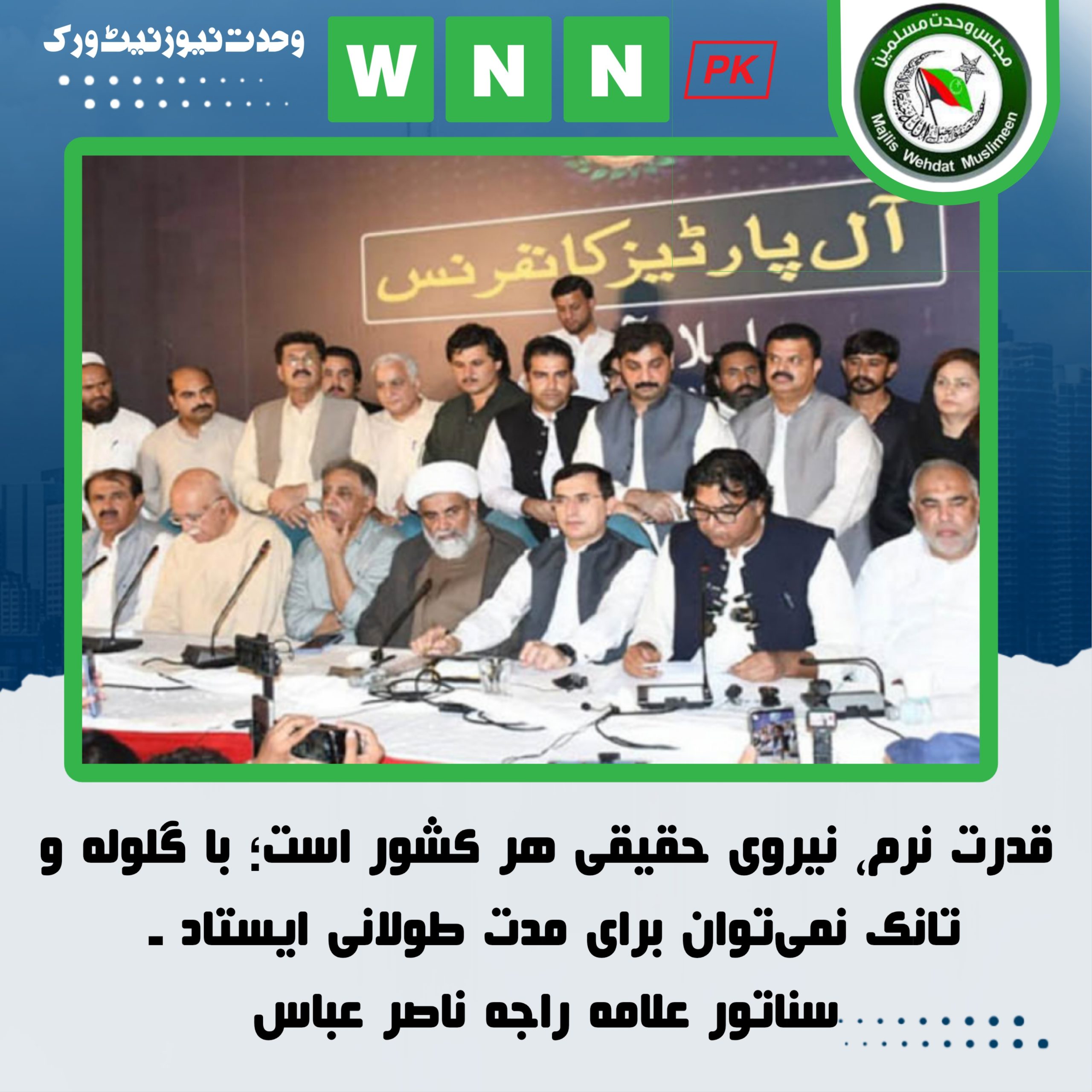 علامہ راجہ ناصر عباس گفت قدرت نرم دلها را فتح میکند، جایگاه جهانی شما را بالا میبرد و مردم به شما اعتماد میکنند. اما در این کشور قدرت نرم از میان رفته و جامعه دچار فروپاشی شده است. بنابراین ضروری است که به قانون اساسی بازگردیم؛ برای خاطر پاکستان، برای خاطر ملت، برای آیندهمان و برای خدا. اگر به قانون اساسی بازنگردیم، روزی فراخواهد رسید که با پیمودن راههای نادرست، به ورطه سقوط خواهیم افتاد.۔۔۔۔