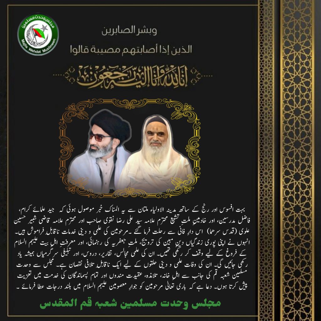 مجلس وحدت مسلمین شعبہ قم المقدس نے مرحومین کے خاندانوں، دوستوں، اور چاہنے والوں سے اظہار ہمدردی کرتے ہوئے دعا کی کہ اللہ تعالیٰ مرحومین کو اپنے جوار رحمت میں جگہ عطا فرمائے اور ان کے لواحقین کو صبر جمیل سے نوازے۔