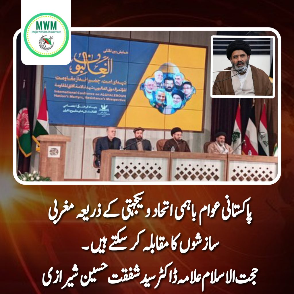 حجت الاسلام والمسلمین شفقت حسین شیرازی نے پاکستانی عوام کے مغربی سازشوں کے خلاف کردار اور مقاومتی محور کے ساتھ ہم آہنگی پر زور دیتے ہوئے کہا: پاکستانی عوام اتحاد اور یکجہتی کے ذریعہ مغربی سازشوں کا مقابلہ کرسکتے ہیں۔